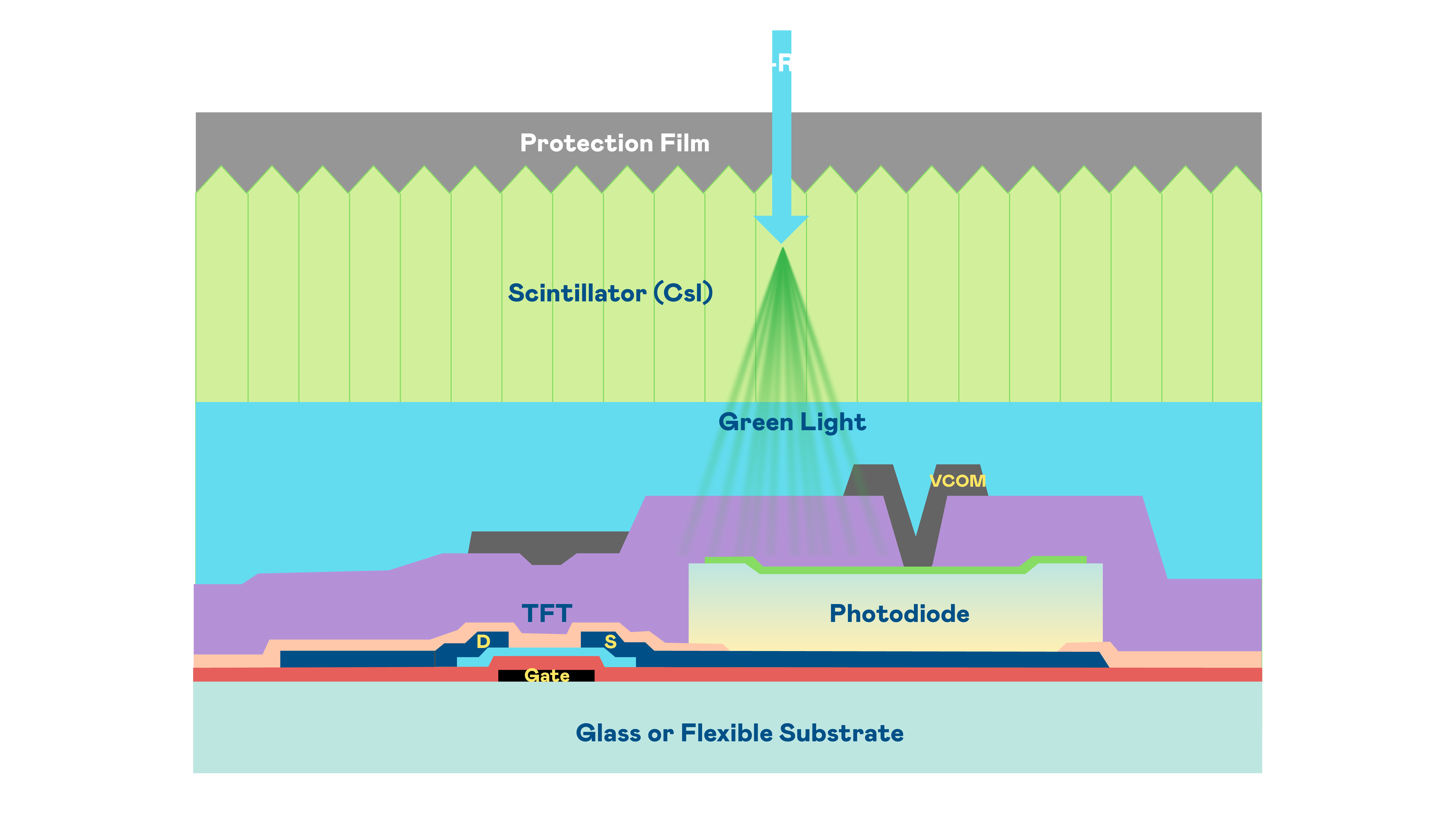 尊龙凯时官网的X光影像感测阵列使用薄膜电晶体 (TFT) 作为每个像素的读取开关,搭配光电二极体(Photodiode)的光电转换元件,用以感测X光影像讯号。